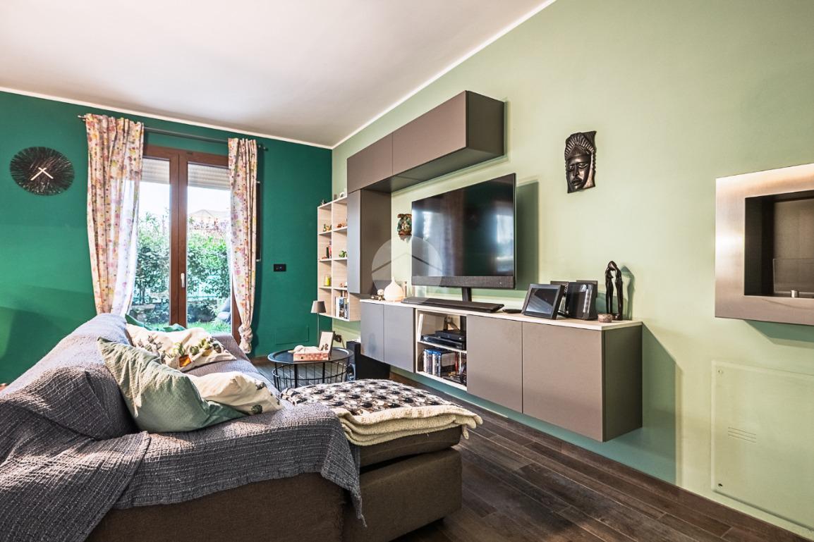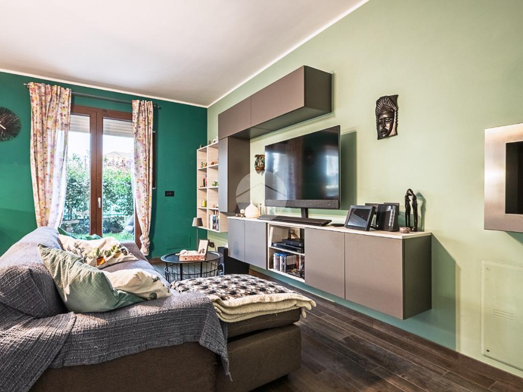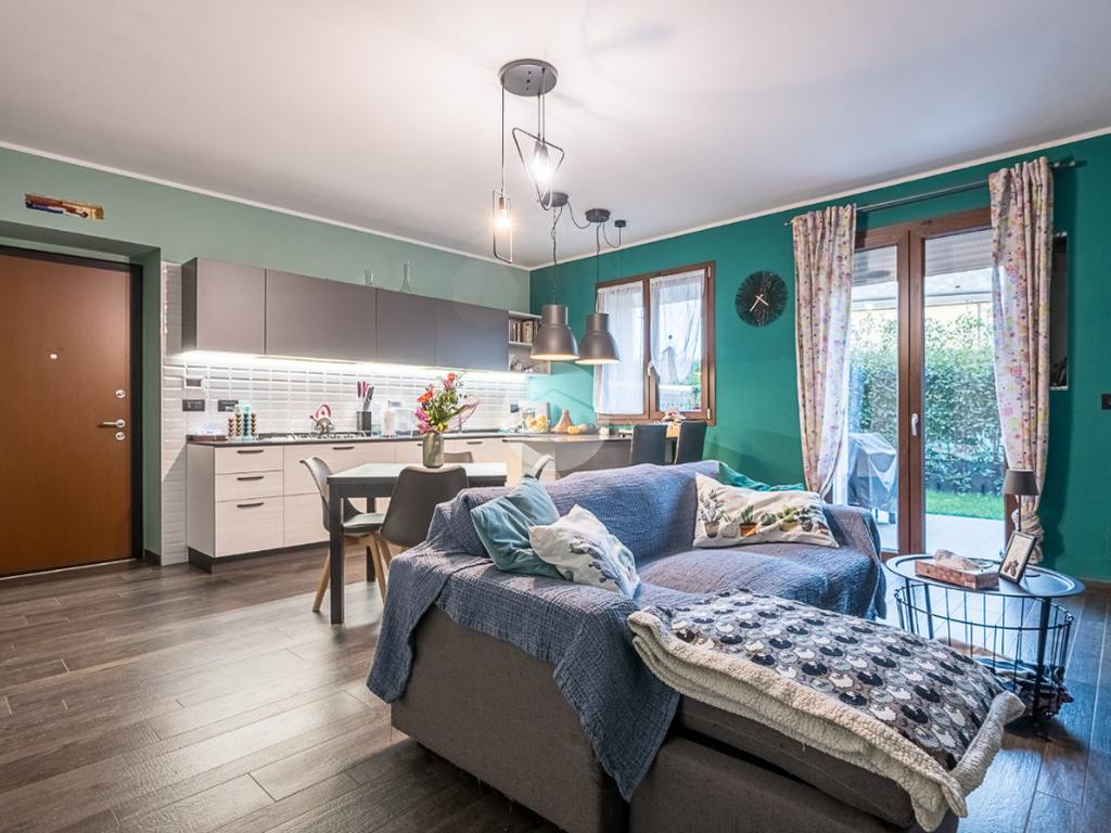 L’immobile si compone di ingresso living in soggiorno con angolo cottura, luminoso e funzionale, collegato tramite portafinestra in PVC con doppio vetro al giardino privato, ideale per chi desidera vivere gli spazi esterni in totale privacy.