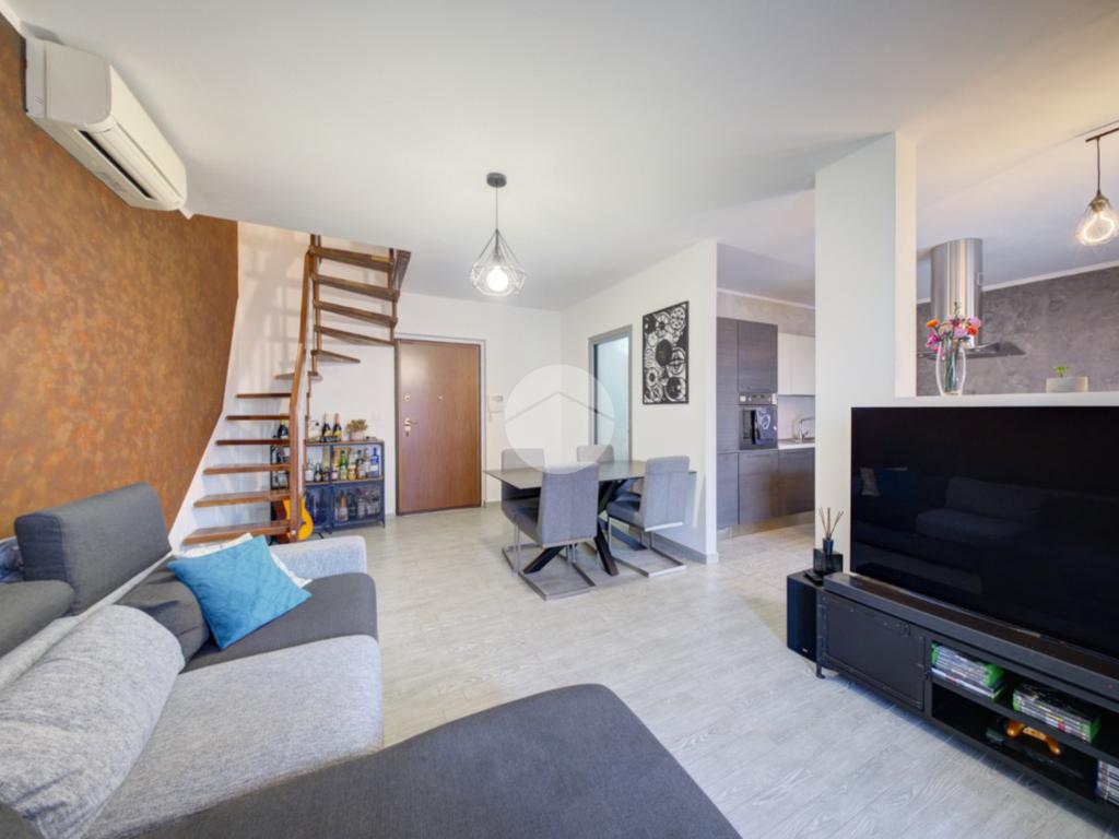 L’appartamento, sito al primo e ultimo piano, si sviluppa su due livelli: la zona giorno è caratterizzata da una cucina con isola, vero cuore della casa, in comunicazione con il soggiorno living. Completano il piano un disimpegno e un bagno principale finestrato dotato di box doccia.